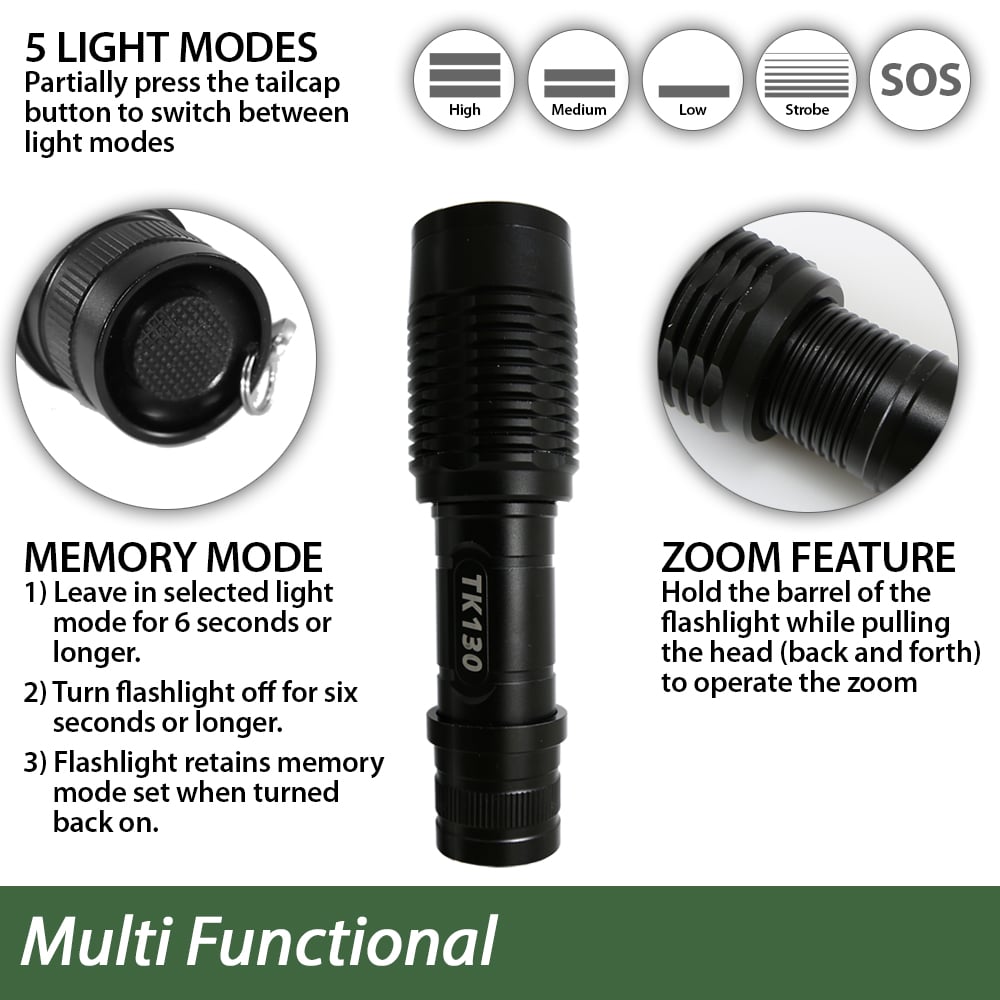 Adjustable Focus Zoom More than just a battery-powered AAA flashlight with a zoom focus beam. The TK130 Flashlight offers a unique adjustable zoom allowing you to focus the light beam to enhance light on a targeted area. This feature is useful when a narrower beam is needed in order to see something specific from a long distance. For example, a security guard approaching a potentially dangerous situation, or a hunter moving up on an animal would find this particularly useful. 5 Light Modes AAA Flashlight with ZoomThe TK130 Flashlight offers five different light modes which include High, Medium, Low, Strobe and SOS. Changing to a different light mode is as simple as a quick-click on the tail-cap button. The multiple light modes are designed to accommodate you in nearly any situation.