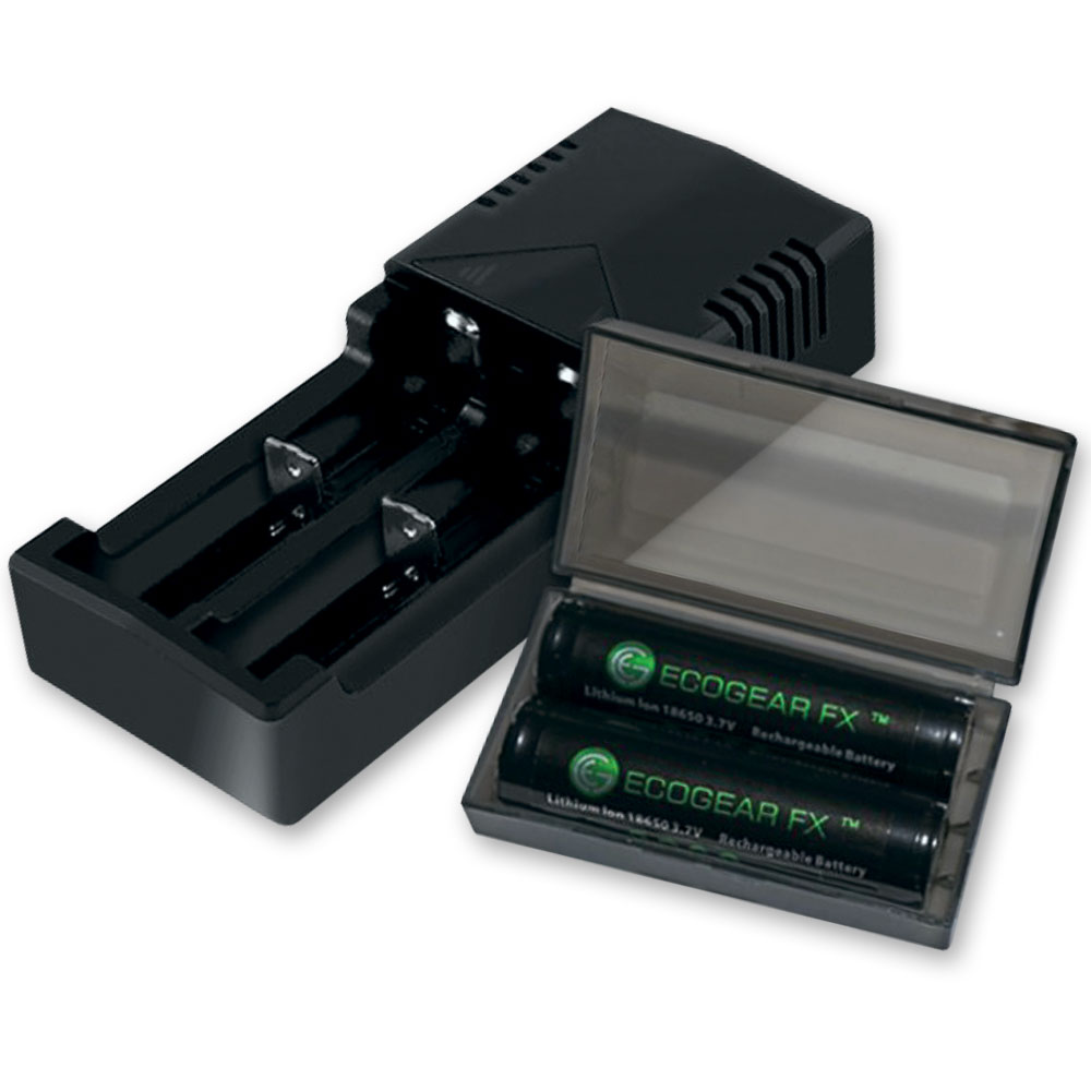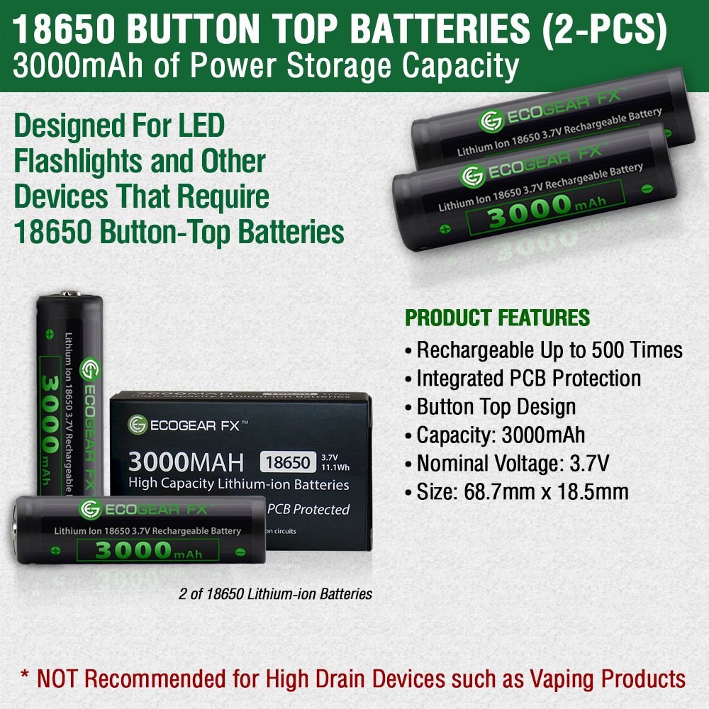 This is a complete Battery Kit which includes a battery charger with 2 charging bays, a 2-pack of 18650 button top batteries and a free battery storage case. The 18650 button top lithium-ion rechargeable batteries offer 3000mAh of power. The batteries offer low self-discharge and can be recharged up to 500 times. These 18650 batteries are a perfect choice for a high powered tactical flashlight or other low drain devices which require button top batteries. The battery charger has two separate charging slots, each of which charges and monitors a battery independently. Batteries can be charged simultaneously and the charger automatically detects the battery status and applies the appropriate charge mode. The chargers LED lights will display the batteries charging progress. Once charging is complete the charger will auto-stop. 18650 Batteries and ChargerCharger Specifications: • Charges 2 Batteries Simultaneously • Automatically Detects Battery Status and Selects the Appropriate Charge Mode • LED Lights Display Charging Progress • Auto-Stops Charging when Complete • Detachable Power Cord • Certified by RoHS, CE, FCC • Compatible with Batteries Li-ion: 18650, 17670, 18490, 17500, 17335, 16340 (RCR123), 14500, 10440 Ni-MH: AA, AAA Battery Specifications: • Capacity: Nominal: 3000mAh, Minimum: 2800 mAh • Internal PCB Protection: Prevents under-voltage at 2.5V and over-voltage at 4.25V • Nominal Voltage: Average 3.7V • Cut-off Voltage: 2.5V • Internal Impedance: less or equal to 180 milli-ohm (with PTC) • Cycle Performance: 90% of initial capacity at 400 cycles • Cycle life: > 500 cycles • Charge: Current = 0.5C (~1500mA) Voltage = 4.2 V End Current = 0.01 mA • Discharge: Current = 0.5C (~1500mA) End Voltage = 3.0V • Dimensions: Diameter: 18.5 mm, Length: 68.7 mm These batteries are NOT recommended for high-drain devices (i.e. Vaping Products).